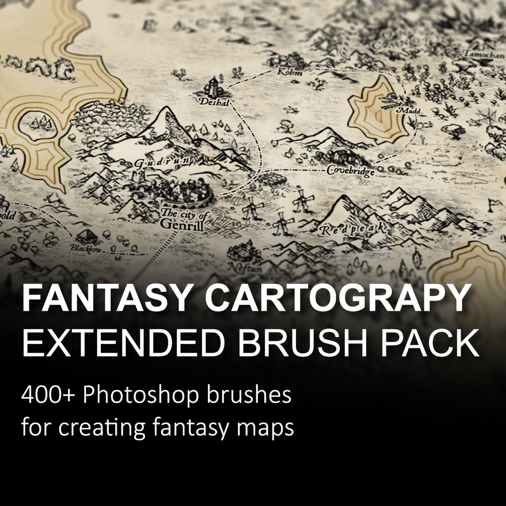 This brush pack for Photoshop contains over 400 brushes for creating hand-drawn style fantasy maps for personal use.