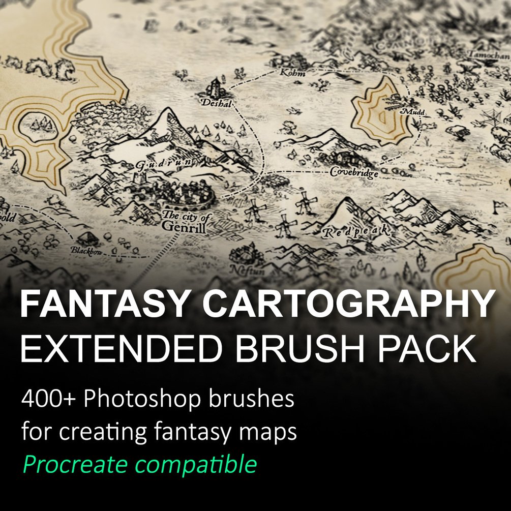 This brush pack for Photoshop and Procreate contains over 400 brushes for creating hand-drawn style fantasy maps for personal use.